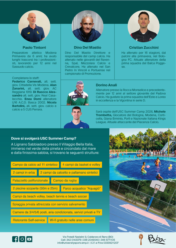Il Summer Camp si svolgerà al Bella Italia di Lignano Sabbiadoro (UD). All’interno di un villaggio dotato di ampi spazi verdi, strutture sportive all’avanguardia, spiaggia e parco acquatico.
